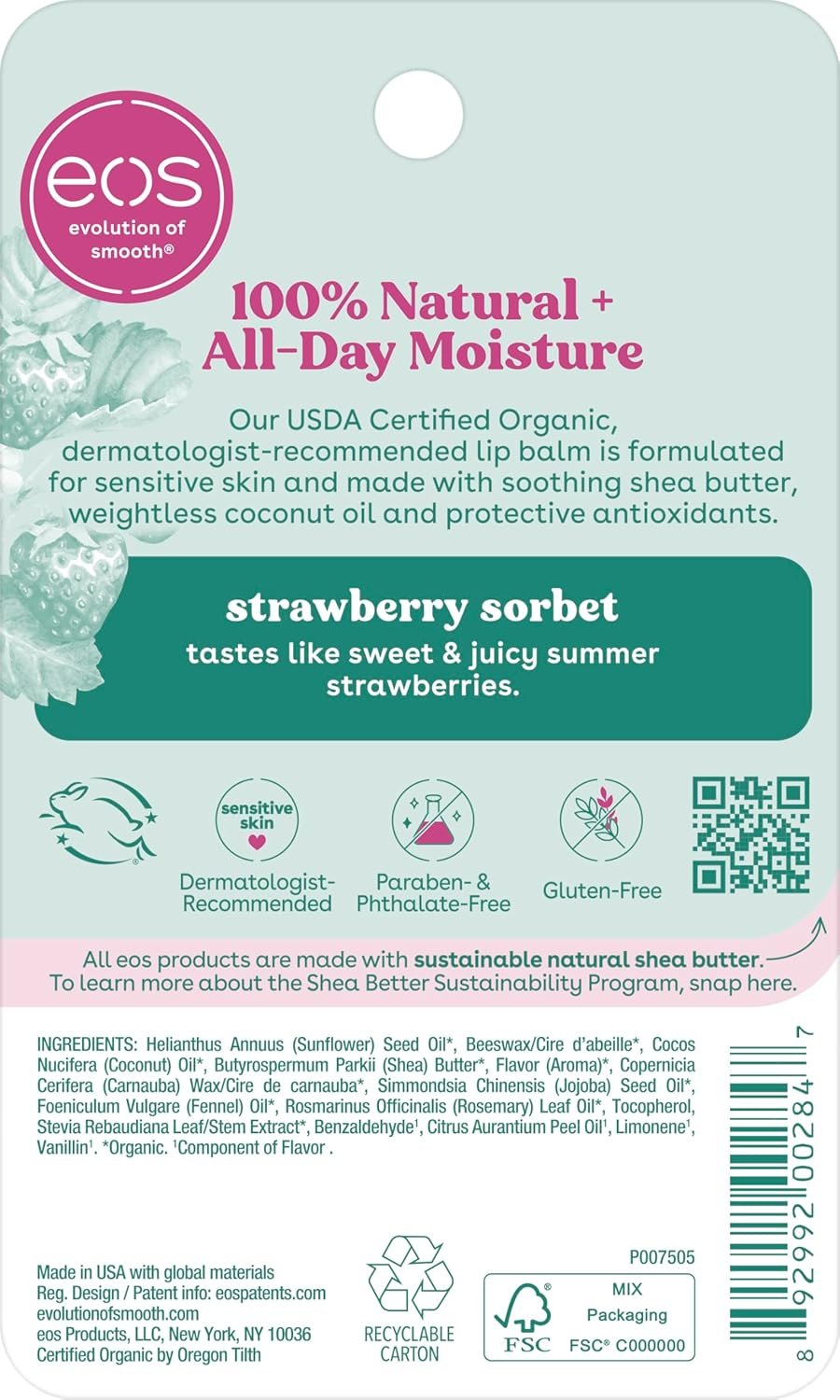 Experience all-day lip hydration with the eos 100% Natural & Organic Lip Balm in Strawberry Sorbet, crafted by the trusted eos brand. This dermatologist-recommended formula features sustainably-sourced shea butter, coconut and jojoba oils, offering powerful moisture and softness—perfect even for sensitive skin. Enjoy a delicious, natural strawberry flavor while knowing your lips are cared for with USDA Certified Organic, paraben-free, and cruelty-free ingredients. Upgrade your lip care routine with this delightful and eco-conscious choice from eos.